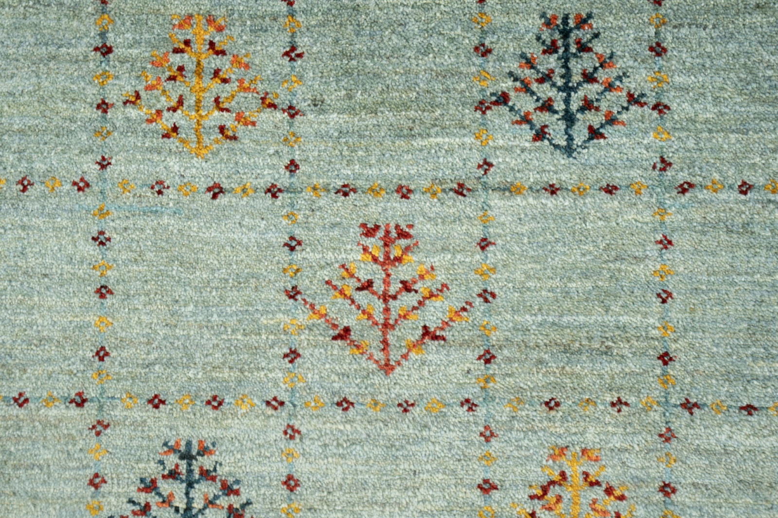 カテゴリー:リビングサイズ小 タグ:カラー:グリーン、カラー:ブルー、文様:生命の樹、織りランク:アマレ