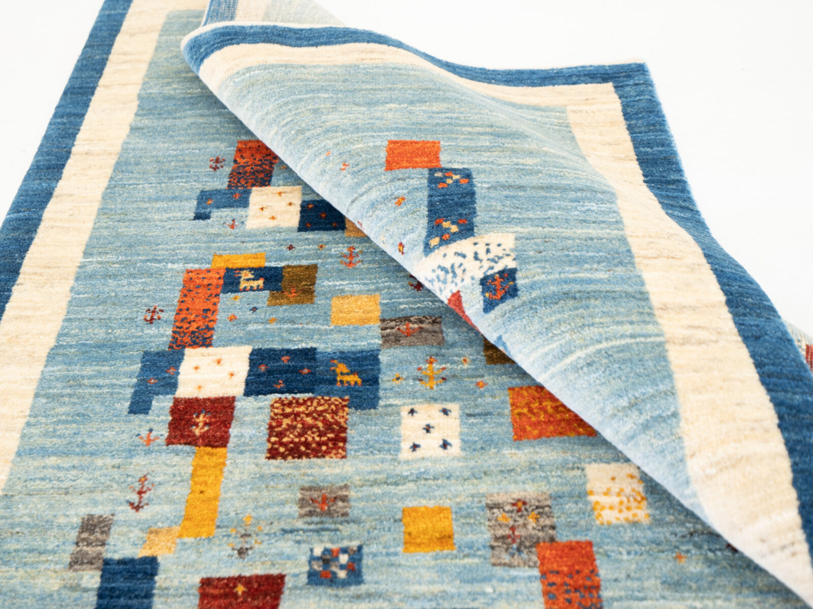 Product手織り絨毯ギャッベ ホーム > インテリア商品 > 手織り絨毯ギャッベ > ギャッベモチーフを青空の中に散りばめて ギャッベモチーフを青空の中に散りばめて カテゴリー:リビングサイズ中 タグ:カラー:カラフル、カラー:ブルー、織りランク:アマレ 品番10078295 織りランクアマレ サイズ188×124cm 素材ウール100% 産地イラン・ファールス州(カシュガイ族) スッキリと爽やかな空色のフィールドに楽しいポップなギャッベモチーフを散りばめて織り子さんのセンスが光りますね。 縁取りに白い原毛と濃い青色のボーダー使いが全体の雰囲気を引き立てます。 この商品についてご相談・お問合せ24時間受付 小さなギャッベモチーフたち 端正なラインの中に広がる草原